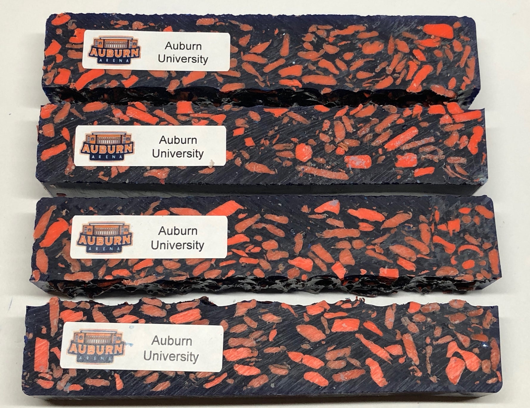 Authentic shredded stadium seat plastic fused with vibrant team-colored resin—tough, one-of-a-kind material built for the lathe.