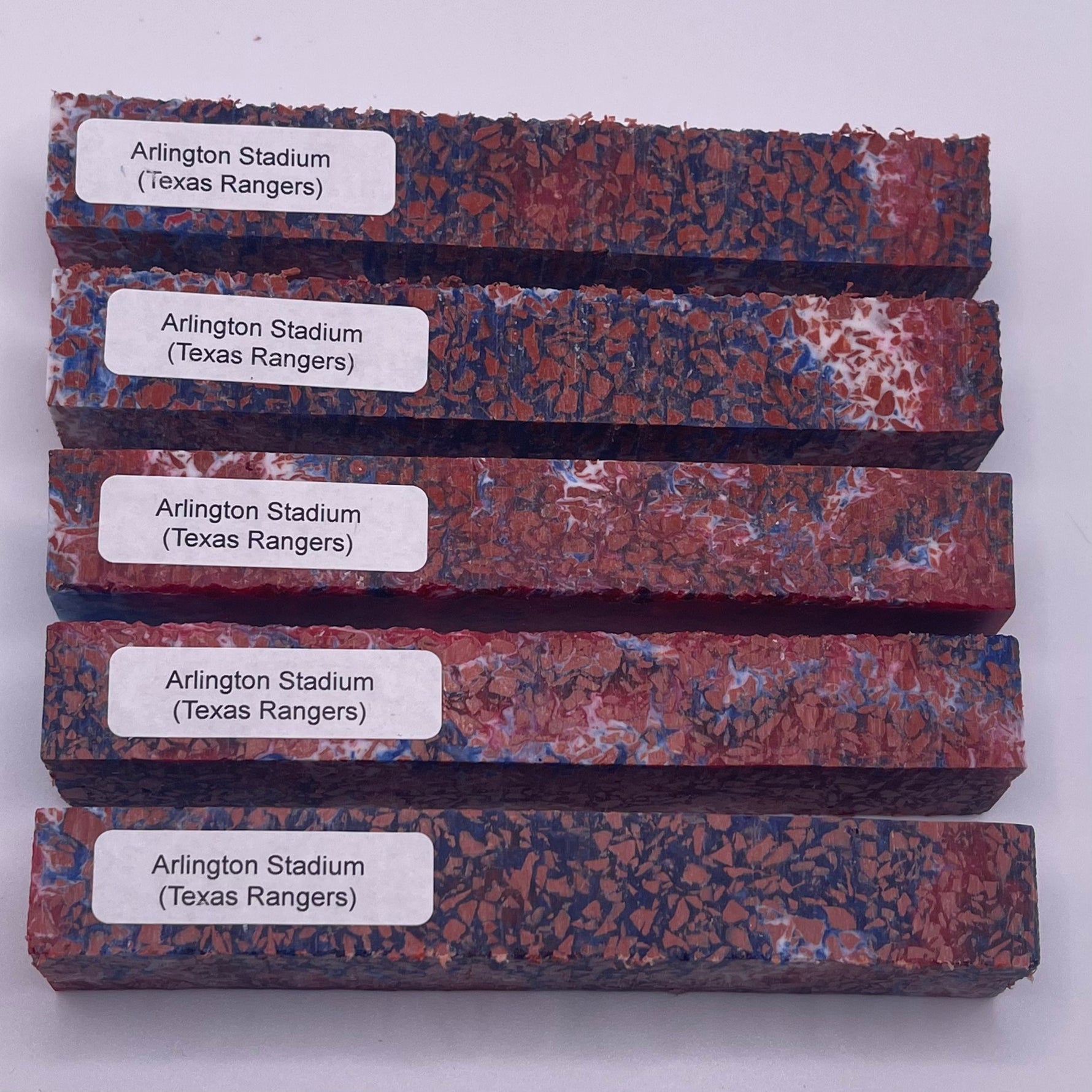 Authentic shredded stadium seat plastic fused with vibrant team-colored resin—tough, one-of-a-kind material built for the lathe.