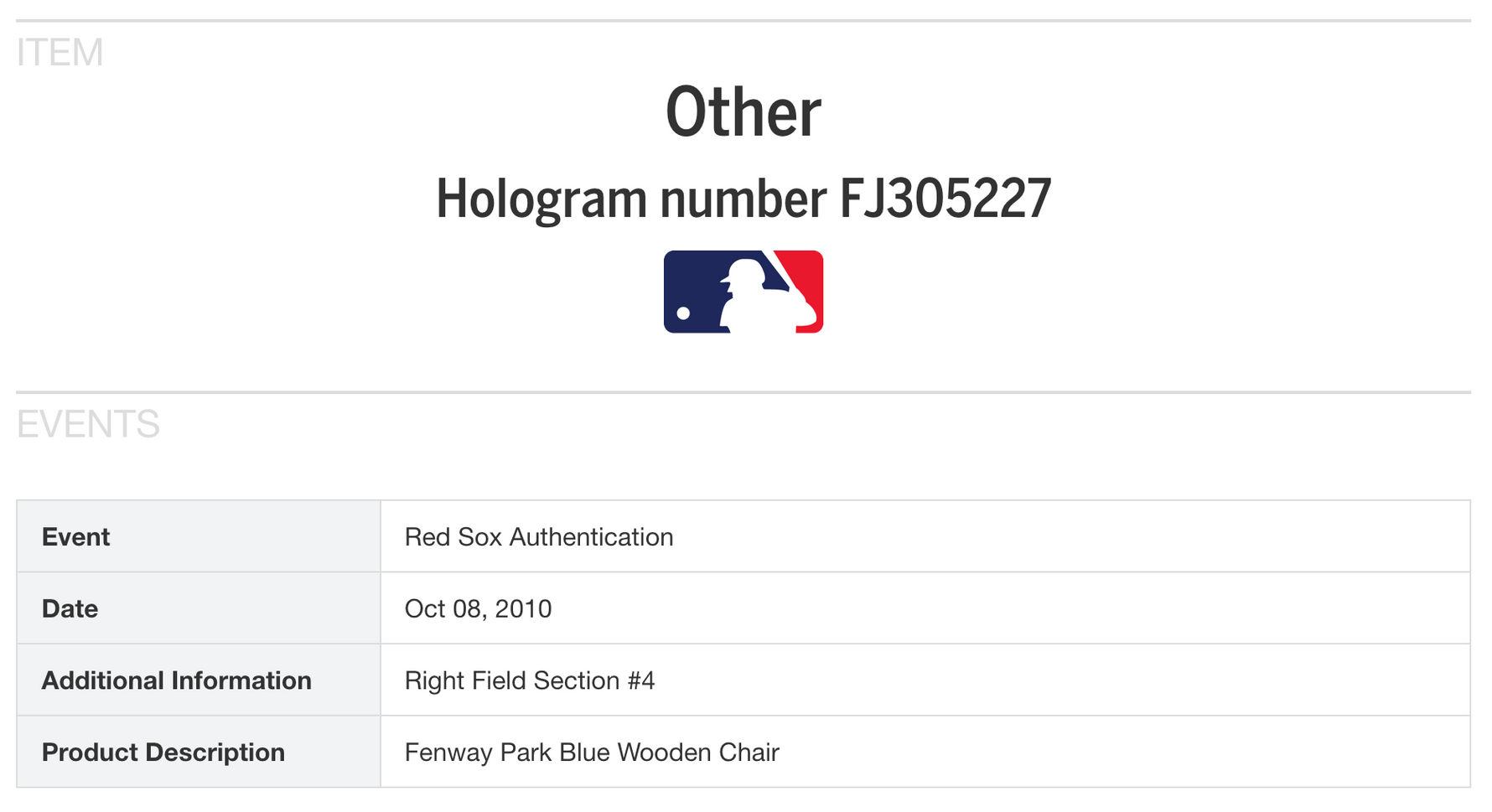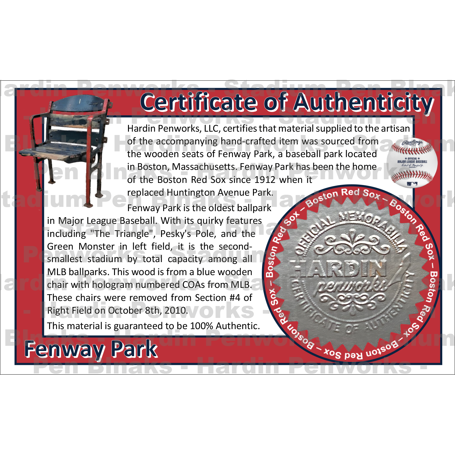 The seat used for these pen blanks was removed from Right Field Section #4. The last day of service was October 8th, 2010. The MLB hologram number FJ305227 is number for the Fenway Park Blue Wooden Chair.