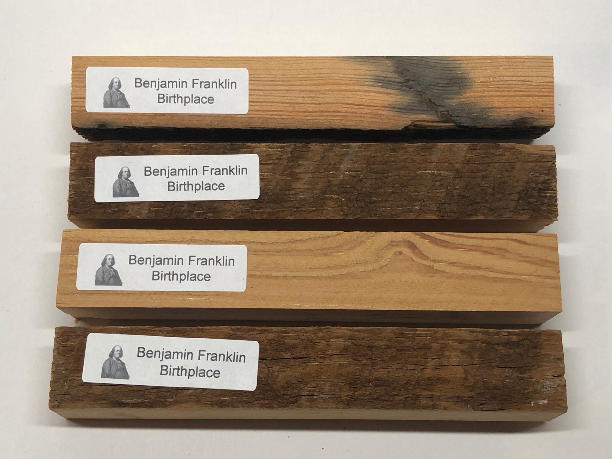 Hardin Penworks, LLC, certifies that the wood supplied to the artisan of the accompanying item was sourced from the historic spruce wood beams of the building currently occupying the original home of Benjamin Franklin on Milk Street.