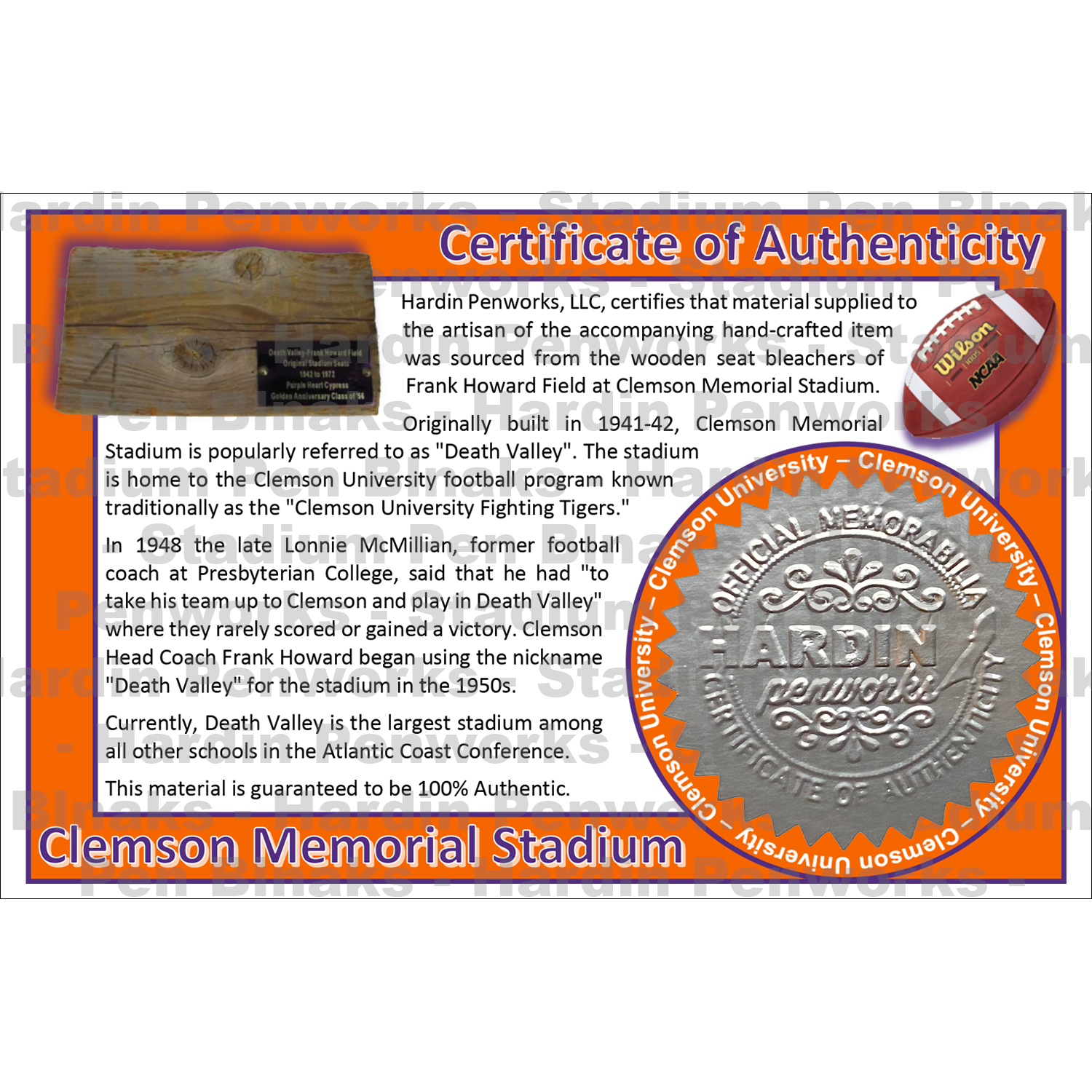 Hardin Penworks, LLC, certifies that material supplied to the artisan of the accompanying hand-crafted item was sourced from the wooden seat bleachers of Frank Howard Field at Clemson Memorial Stadium.