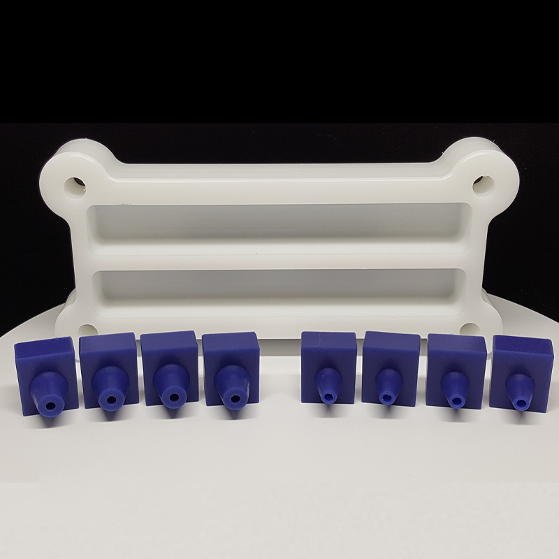 What makes the DogBone so special? To start, it is milled from solid HDPE and is virtually indestructible. It won’t warp or crack like silicone molds. It features two 5.5” x .75” chambers and two sets of silicone inserts. One set has small stoppers for 7mm - 3/8” tubes. The other set has stoppers for 3/8” - 12.5mm tubes. The inserts are replaceable at a cost of $8 per set. The mold body should last for years if properly cared for.