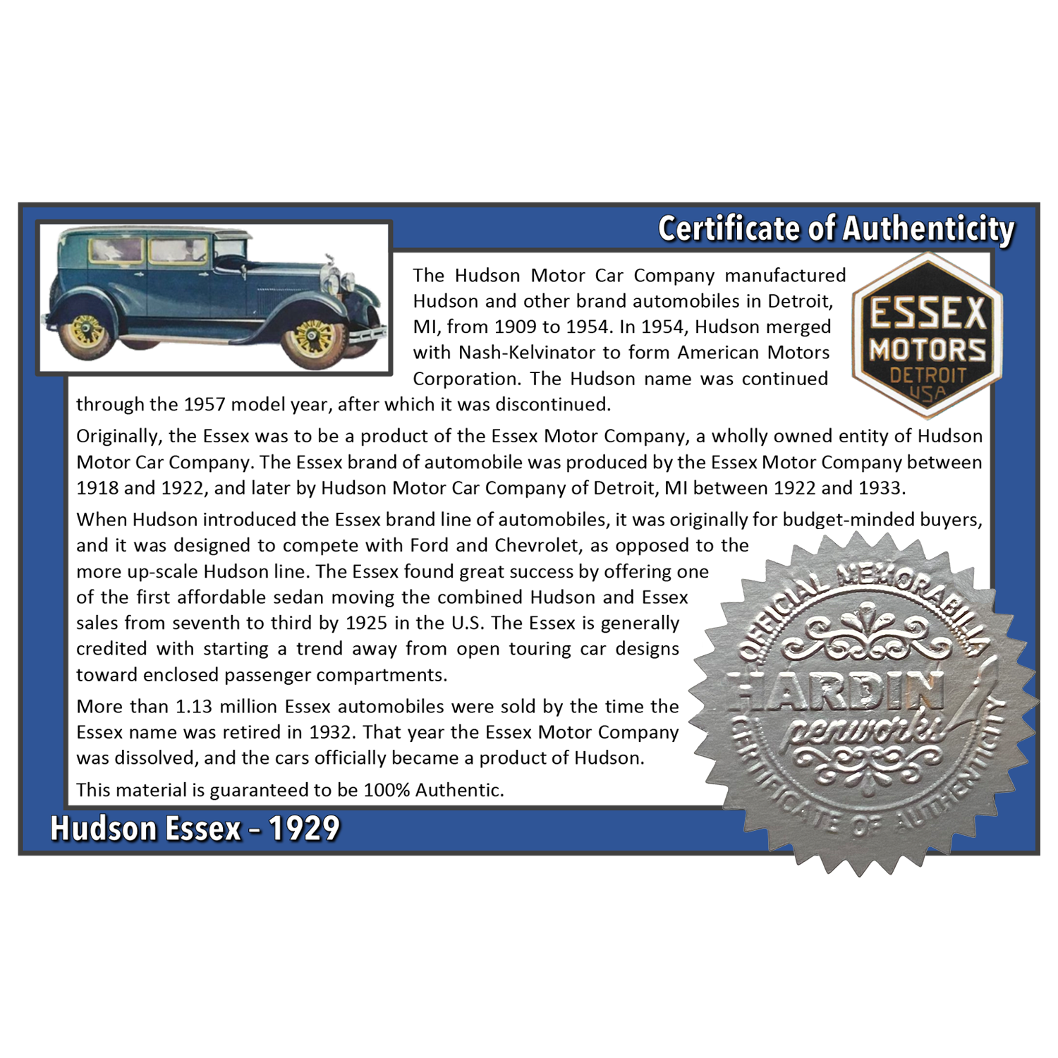 Originally, the Essex was to be a product of the Essex Motor Company, a wholly owned entity of Hudson Motor Car Company. The Essex brand of automobile was produced by the Essex Motor Company between 1918 and 1922, and later by Hudson Motor Car Company of Detroit, MI between 1922 and 1933.