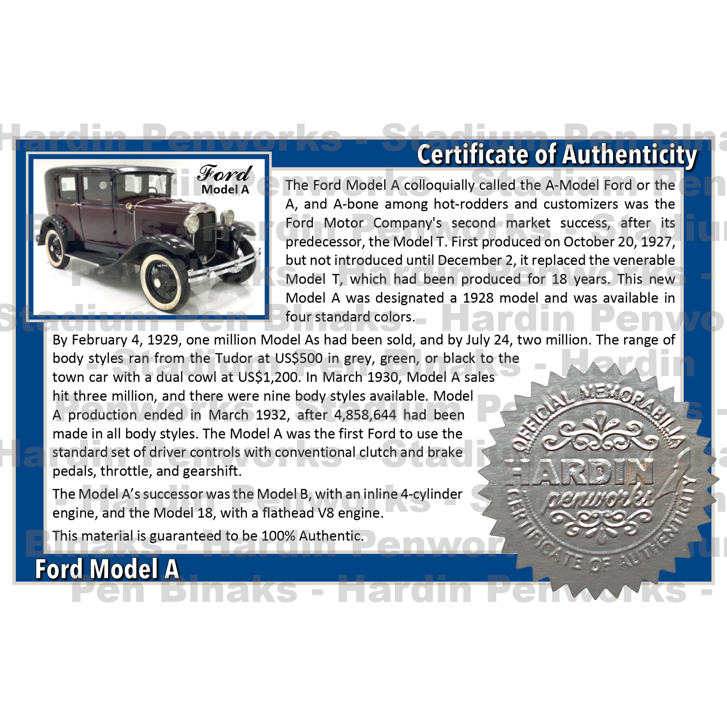 The Ford Model A colloquially called the A-Model Ford or the A, and A-bone among hot-rodders and customizers was the Ford Motor Company's second market success, after its predecessor, the Model T. First produced on October 20, 1927, but not introduced until December 2, it replaced the venerable Model T, which had been produced for 18 years. This new Model A was designated a 1928 model and was available in four standard colors.