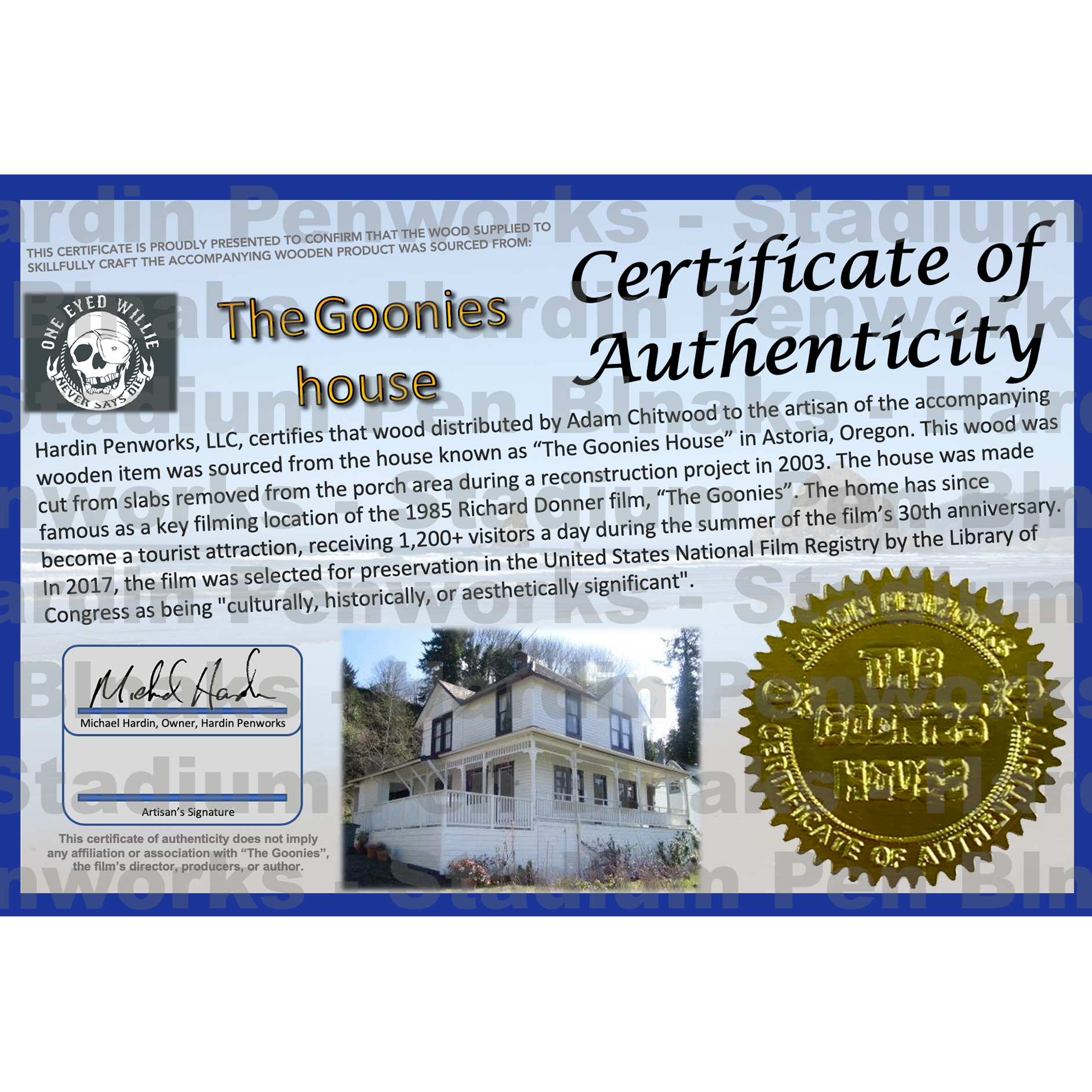 If anyone is needing fancy COAs for your goonies wood. I have several of these still available. Just need to show me your receipt of source for getting your blanks. I reserve the right to cancel ANY orders for these COAs.