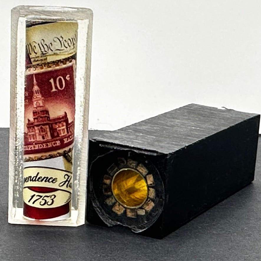 Material: Authentic Independence Hall wood, salvaged from documented renovations, optionally paired with label-cast 1956 Liberty Series - 10¢ U.S. postage stamp featuring Independence Hall for select Full Size Gentlemen and Jr Gent sized pen caps.