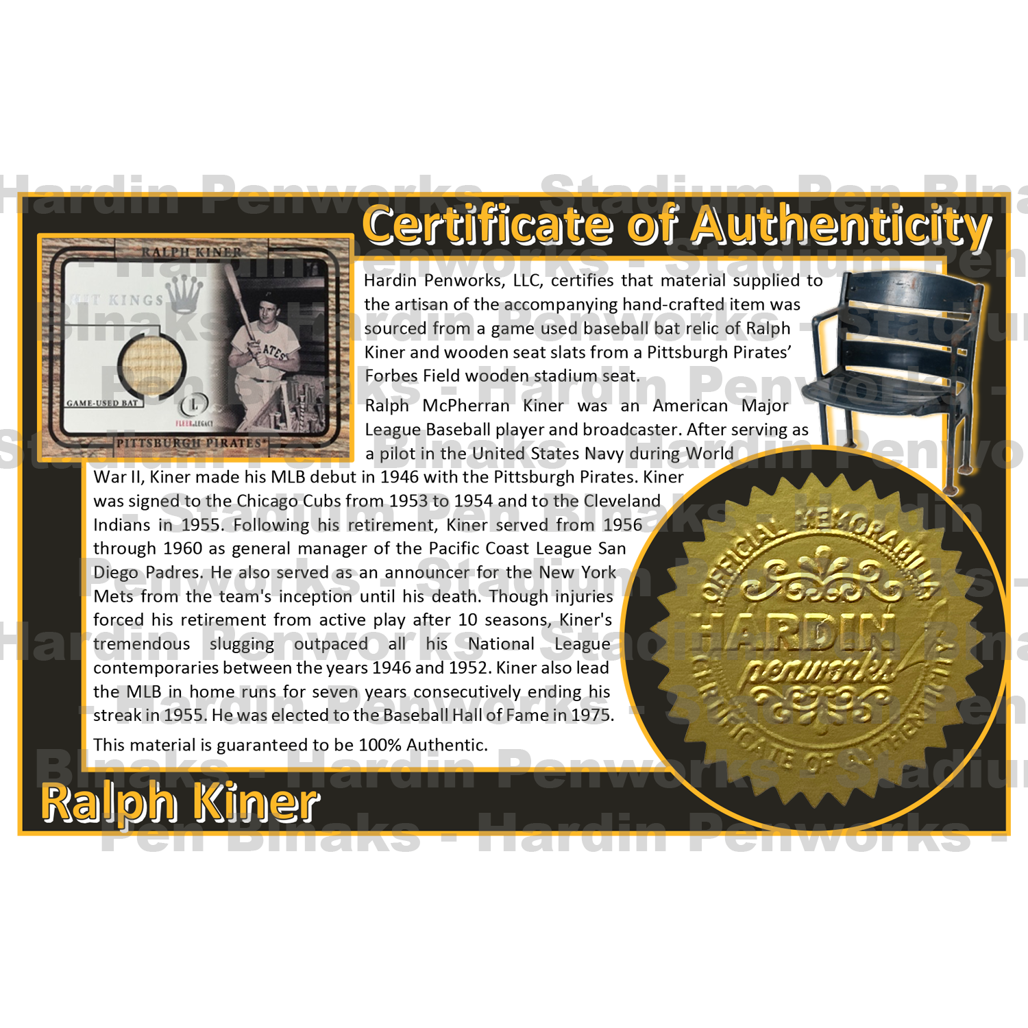 Hardin Penworks, LLC, certifies that material supplied to the artisan of the accompanying hand-crafted item was sourced from a game used baseball bat relic of Ralph Kiner and wooden seat slats from a Pittsburgh Pirates’ Forbes Field wooden stadium seat.