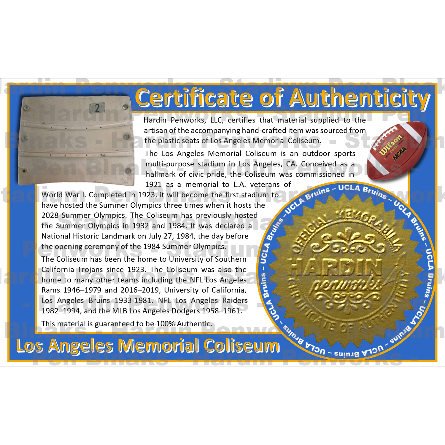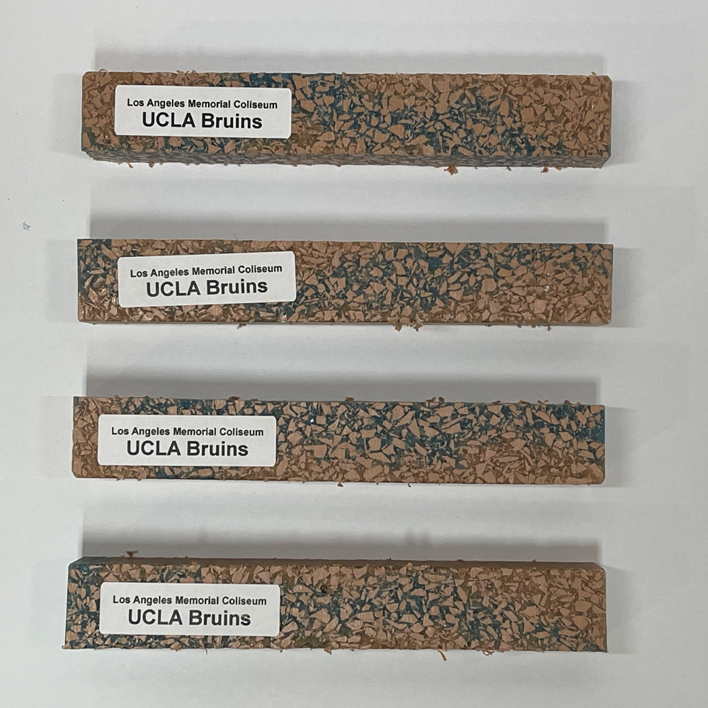 Blanks are chunks of the FADED seats from Los Angeles Memorial Coliseum mixed with University of California, Los Angeles colored resin.