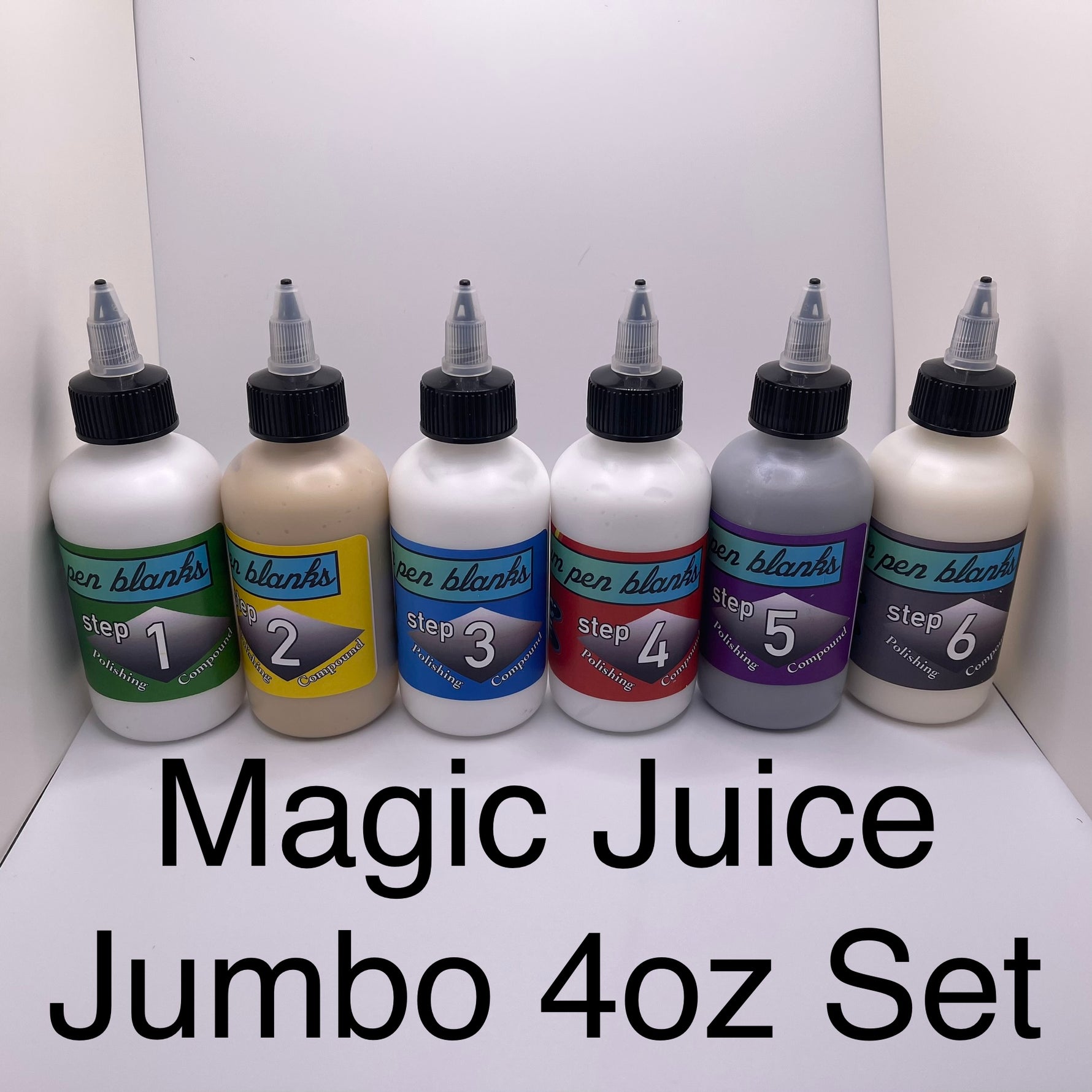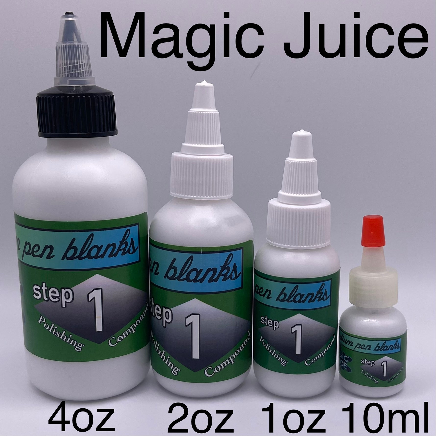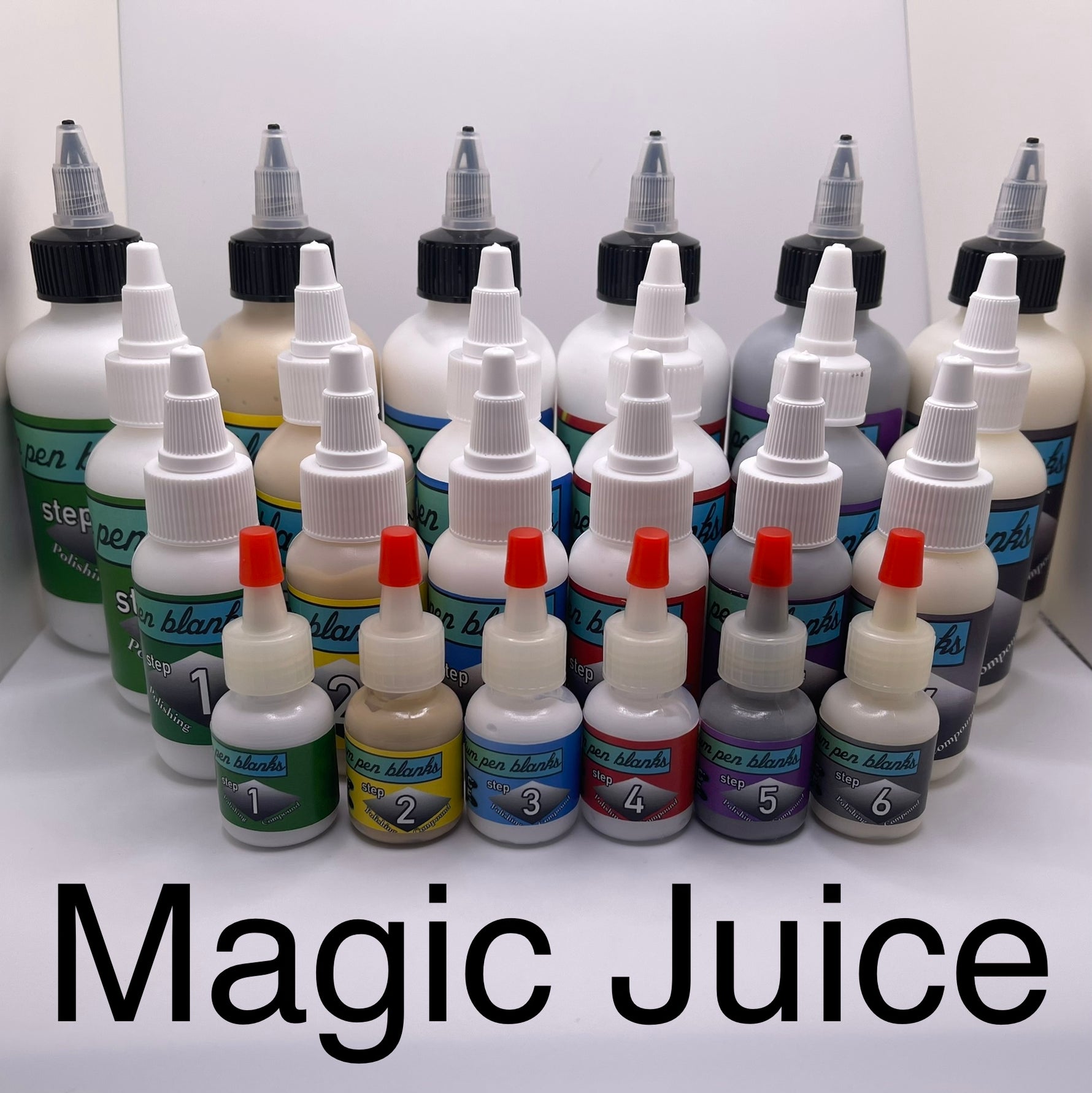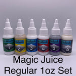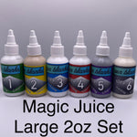 Magic Juice is available in 10ml Sample sets, 1oz sets, and 2oz sets. MJ is also available individually in 2oz bottles.