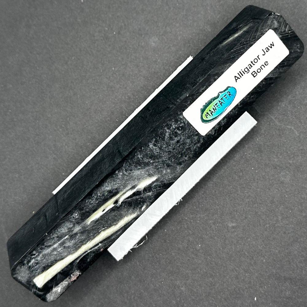 Maneater Alligator Jawbone blanks use JB Royal Original resin combined it with a real jawbone of an alligator to create this eye popping pen blank. The jawbones are meticulously shaped to fit pen blank sized slots of our Dinobone Casting molds. Using a JBR resin colored mixture poured over the jawbone and held under extreme pressure, we cast each jawbone into the works of art you see here. By using JB Royal resin verses a polyester resin, it offers a more stable platform when interacting with the stabilized alligator jaw bone.