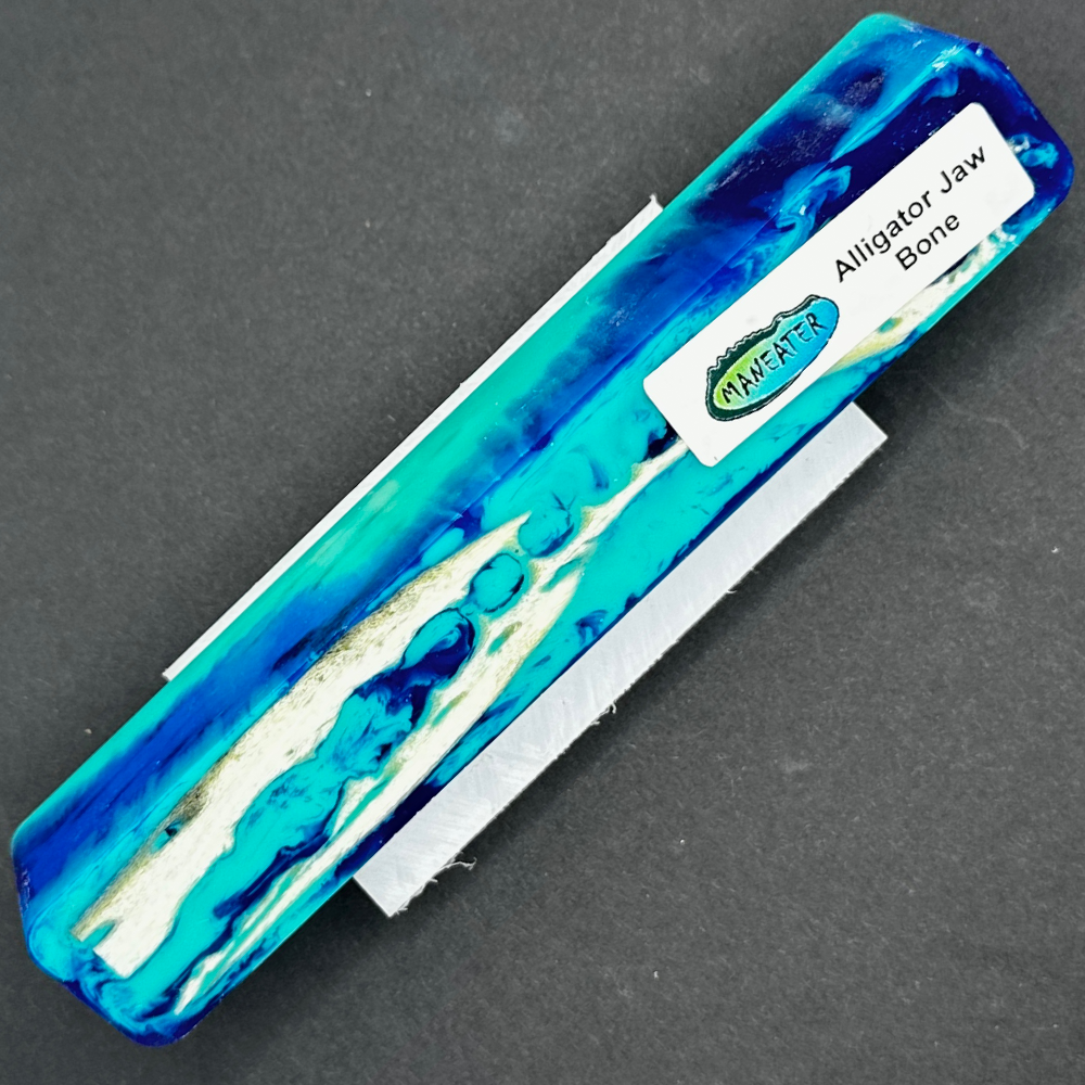 Maneater Alligator Jawbone blanks use JB Royal Original resin combined it with a real jawbone of an alligator to create this eye popping pen blank. The jawbones are meticulously shaped to fit pen blank sized slots of our Dinobone Casting molds. Using a JBR resin colored mixture poured over the jawbone and held under extreme pressure, we cast each jawbone into the works of art you see here. By using JB Royal resin verses a polyester resin, it offers a more stable platform when interacting with the stabilized alligator jaw bone.