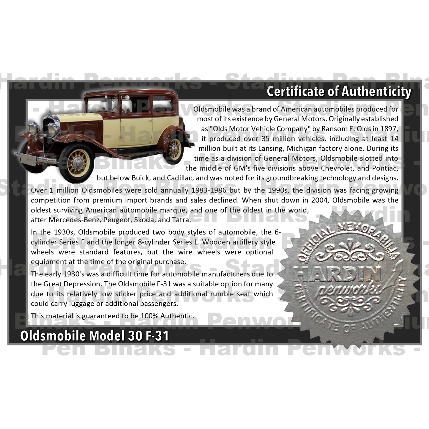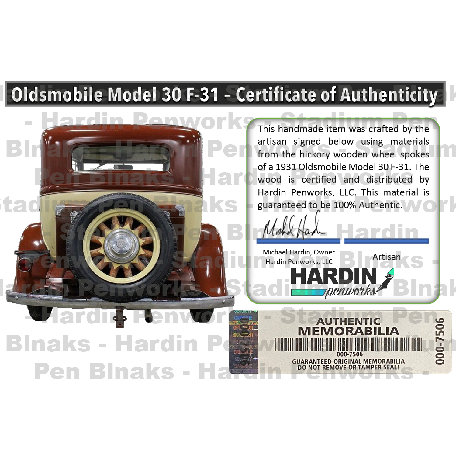 These blanks are made from the hickory wooden wheel spokes of a 1931 Oldsmobile Model 30 F-31. The wood is certified and distributed by Hardin Penworks, LLC. This material is guaranteed to be 100% Authentic.