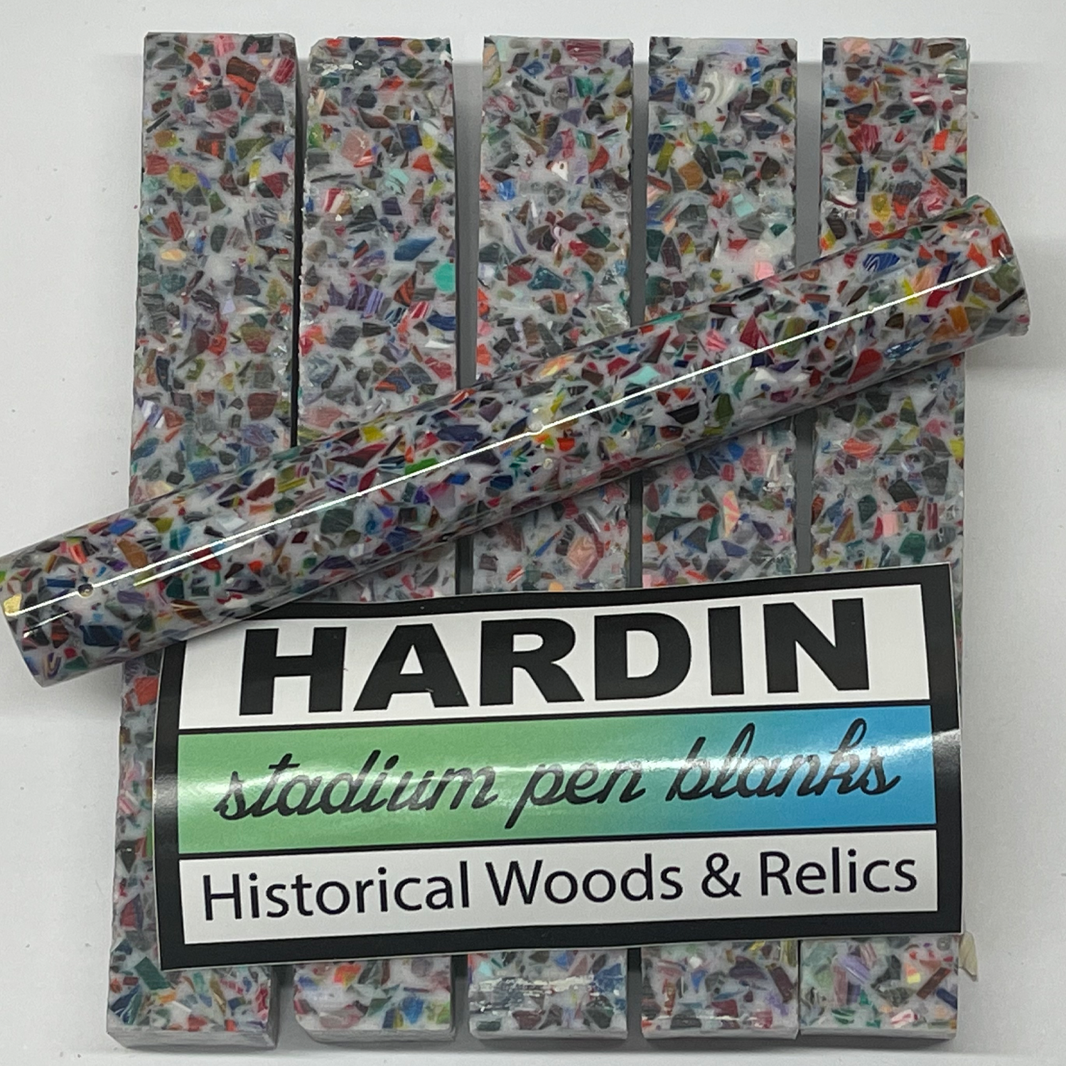 JB Royal OPAL white pearl resin blanks with suspended shredded resin cut-offs from the over-pour of other Alumilite and JB Royal resin blocks. The suspended material is a wild variety of mixes to form a kaleidoscope of colors.