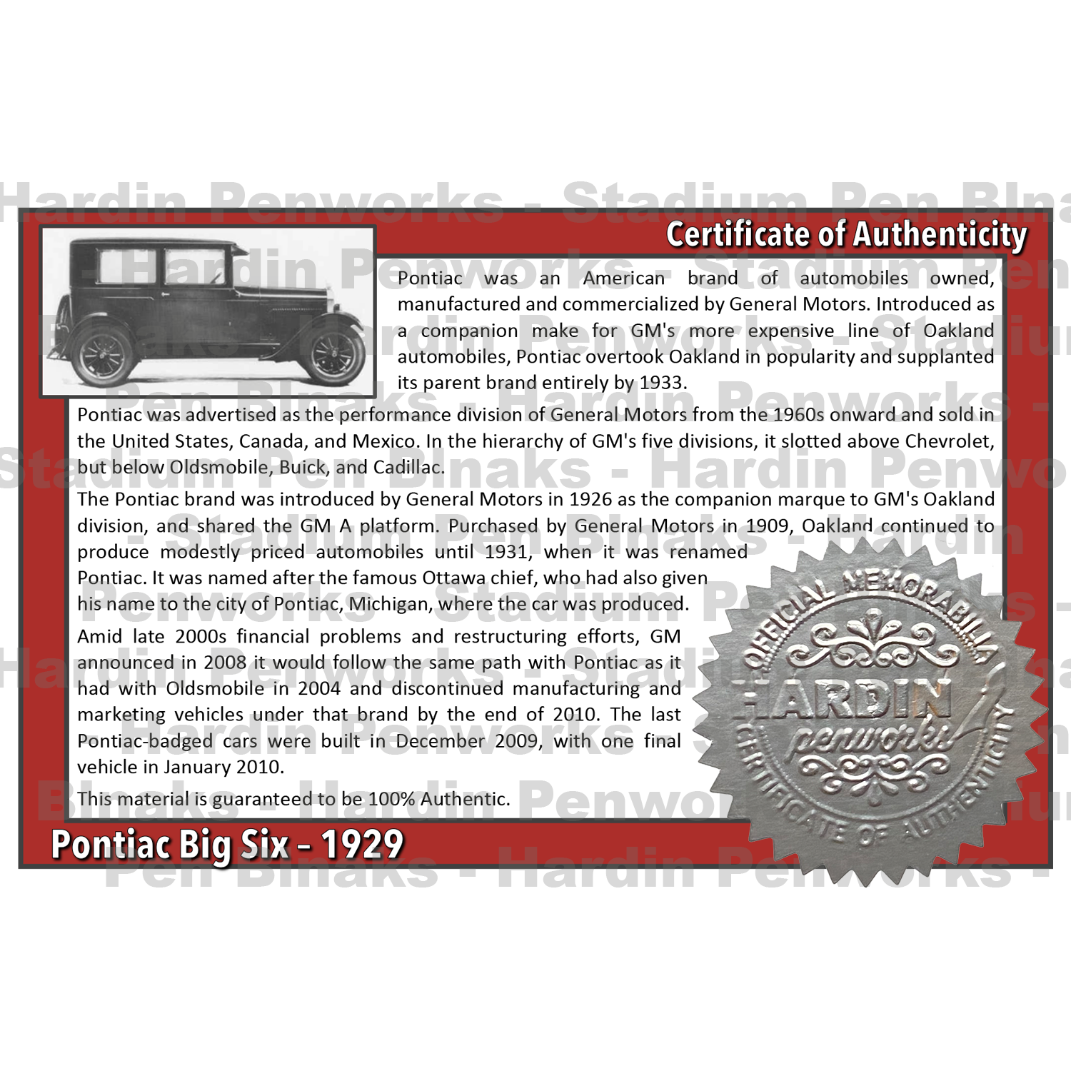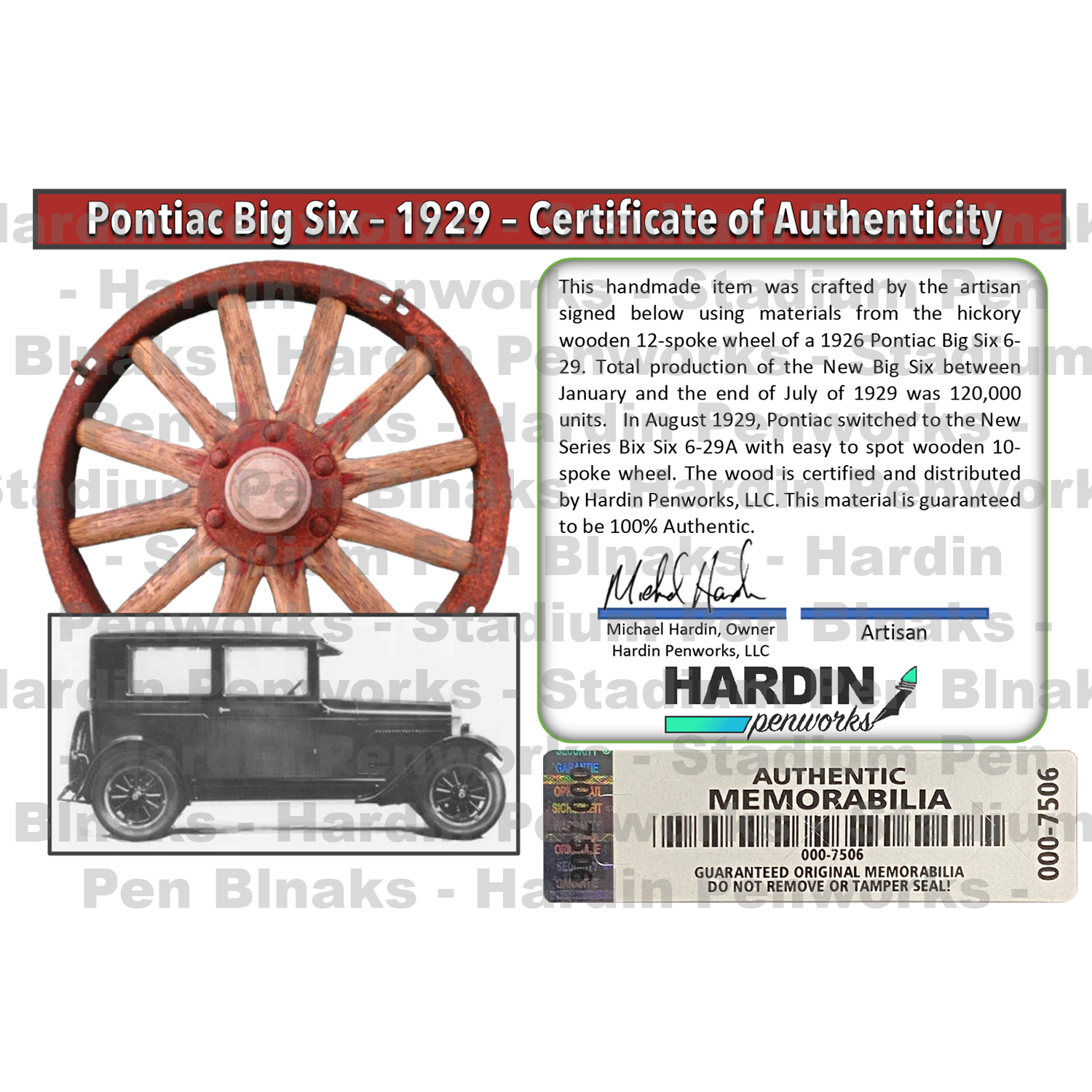 These blanks are from the hickory wooden 12-spoke wheel of a 1926 Pontiac Big Six 6-29. Total production of the New Big Six between January and the end of July of 1929 was 120,000 units. In August 1929, Pontiac switched to the New Series Bix Six 6-29A with easy to spot wooden 10-spoke wheel. The wood is certified and distributed by Hardin Penworks, LLC.