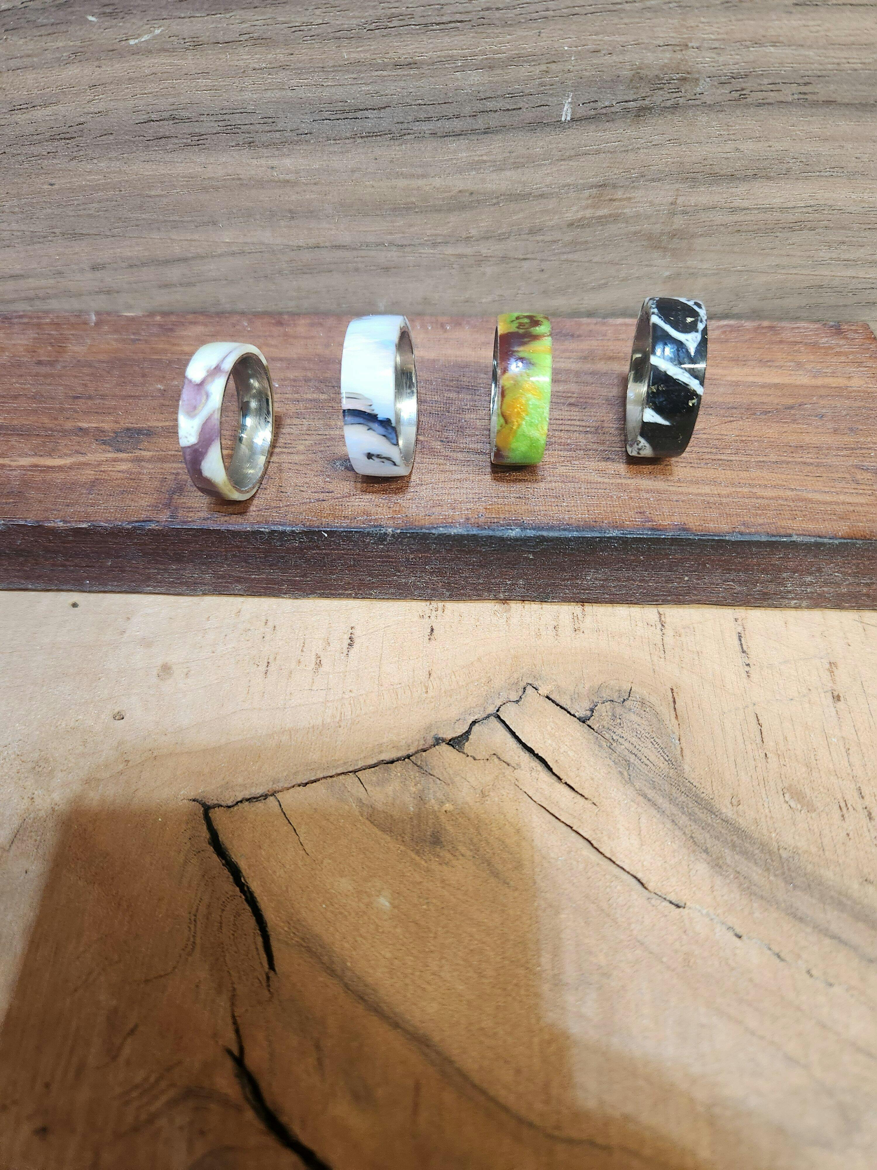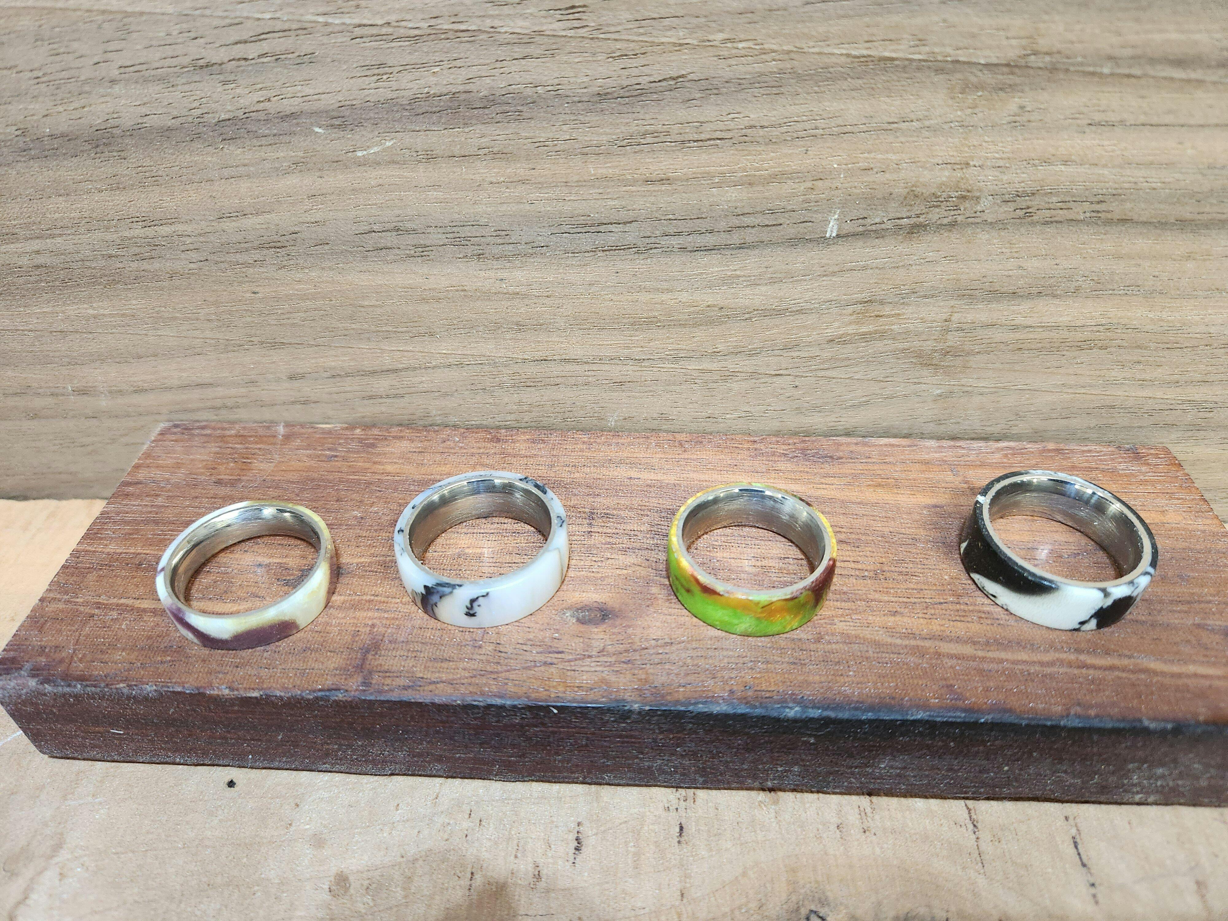 Ray B All four of the ring blanks turned nice. I think one of them was alligator jawbone and black resin. Two of the rings I finished with CA and they seem to be more solid then those I didn't finish with CA. Otherwise the blanks are solid but seems a bit soft. In the pictures the two on the right are not finished with CA.