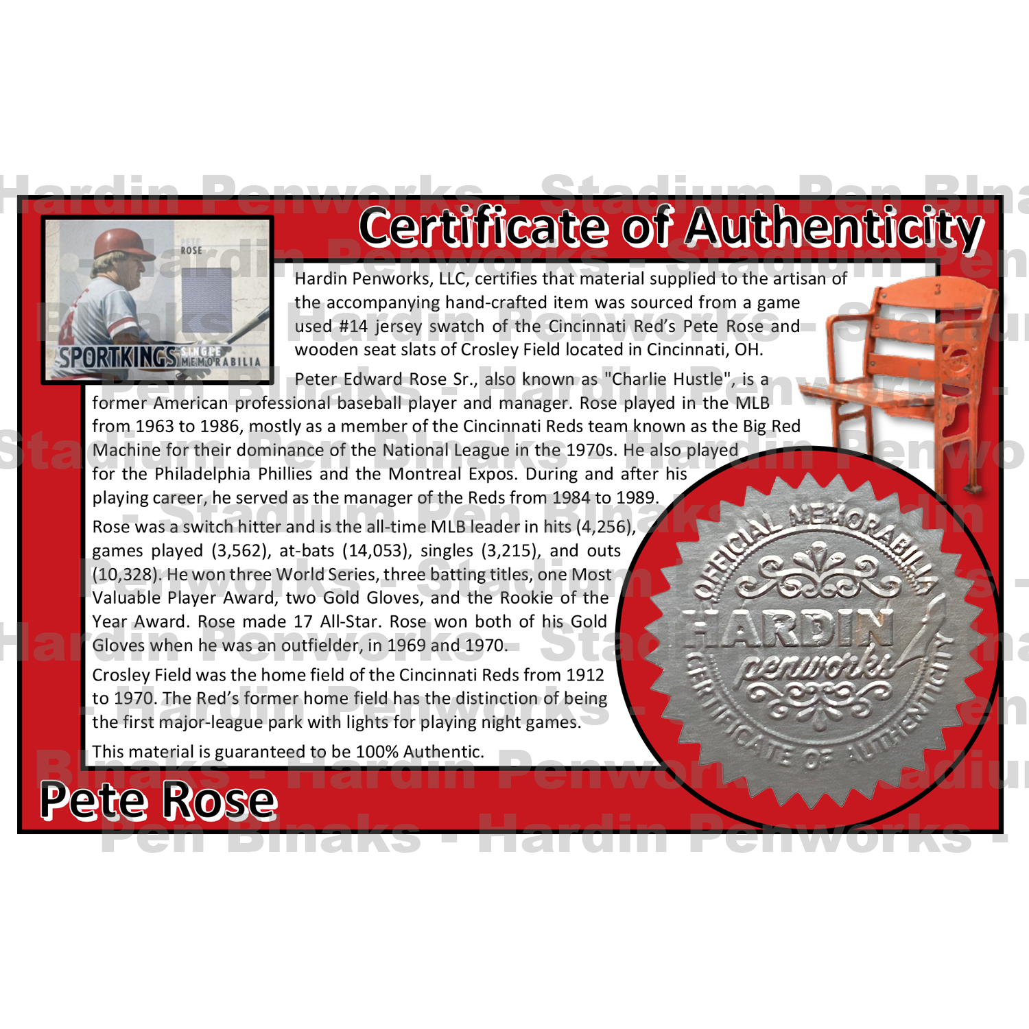 Hardin Penworks, LLC, certifies that material supplied to the artisan of the accompanying hand-crafted item was sourced from a game used #14 jersey swatch of the Cincinnati Red’s Pete Rose and wooden seat slats of Crosley Field located in Cincinnati, OH.