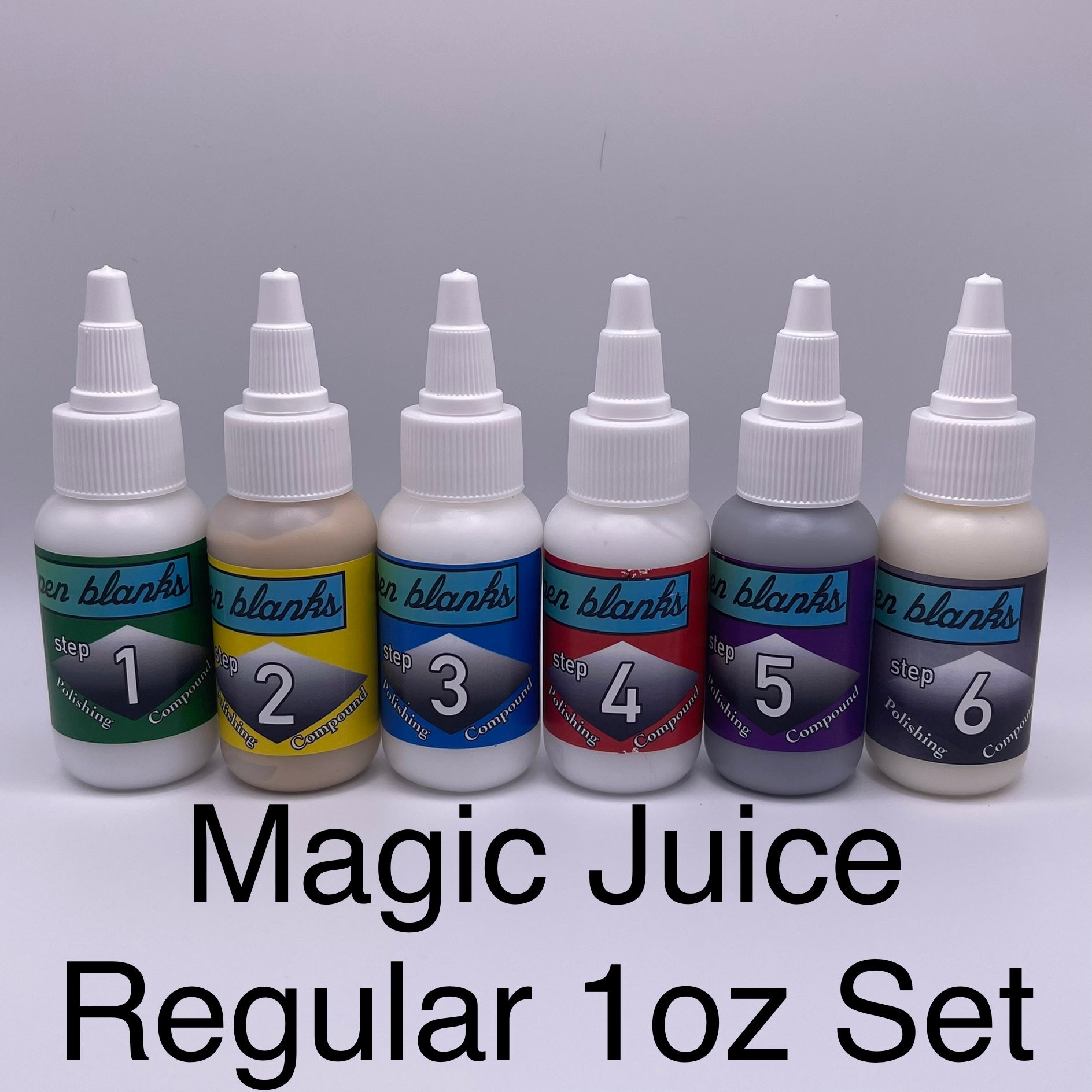 Magic Juice (MJ) is best used as a polishing compound for solid resin materials and plastics. MJ may also be used to polish items with a CA (Cyanoacrylate), CC (Craft Coat), or other similar product finish. For best results of hybrid and worthless wood blanks, a sealing finish of CA, CC, or similar is needed before polishing with MJ.
