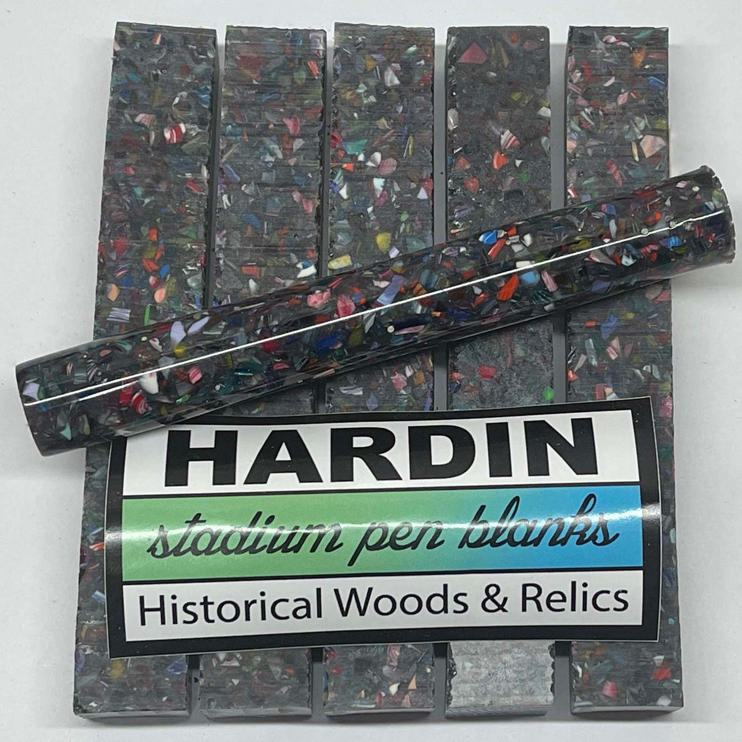 JB Royal BLACK TITANIUM dark silver resin blanks with suspended shredded resin cut-offs from the over-pour of other Alumilite and JB Royal resin blocks. The suspended material is a wild variety of mixes to form a kaleidoscope of colors.