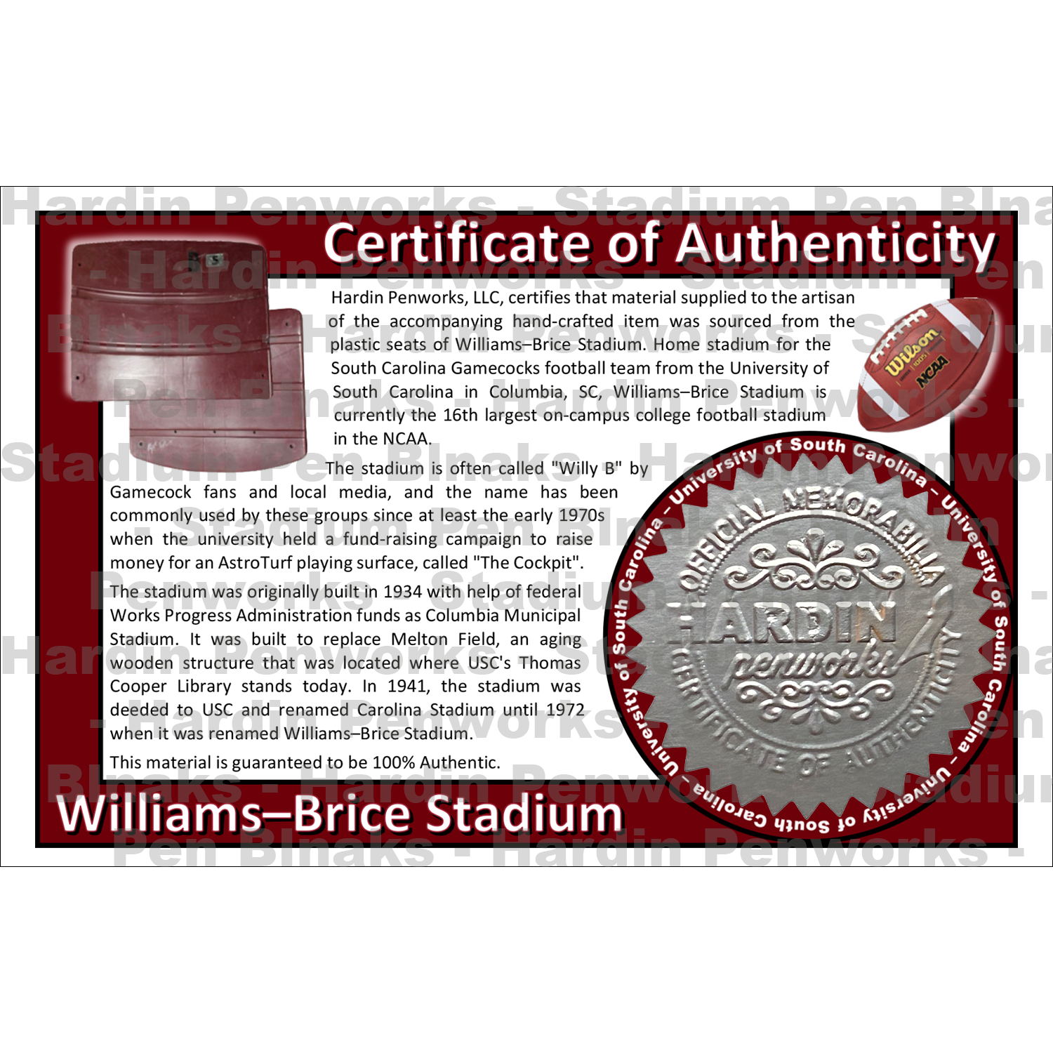 Hardin Penworks, LLC, certifies that material supplied to the artisan of the accompanying hand-crafted item was sourced from the plastic seats of Williams–Brice Stadium. Home stadium for the South Carolina Gamecocks football team from the University of South Carolina in Columbia, SC, Williams–Brice Stadium is currently the 16th largest on-campus college football stadium in the NCAA.